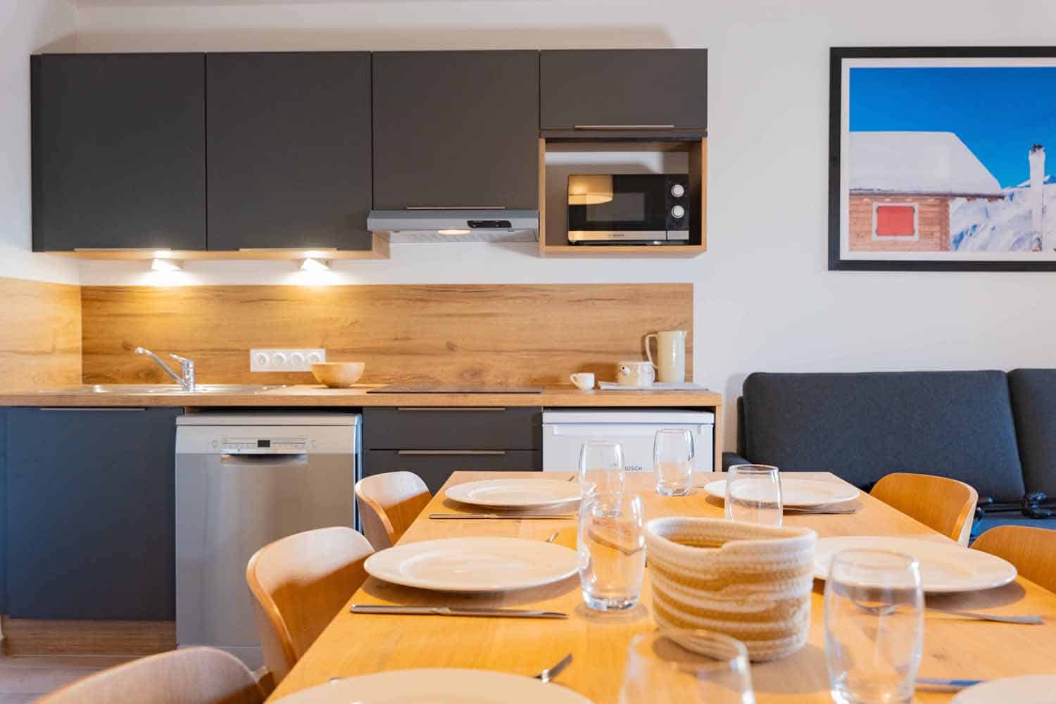 Kitchenette équipée (réfrigérateur, plaques vitrocéramiques, micro-ondes, lave-vaisselle) + Salle de bains (baignoire ou douche), WC séparés, balcon, casier à skis